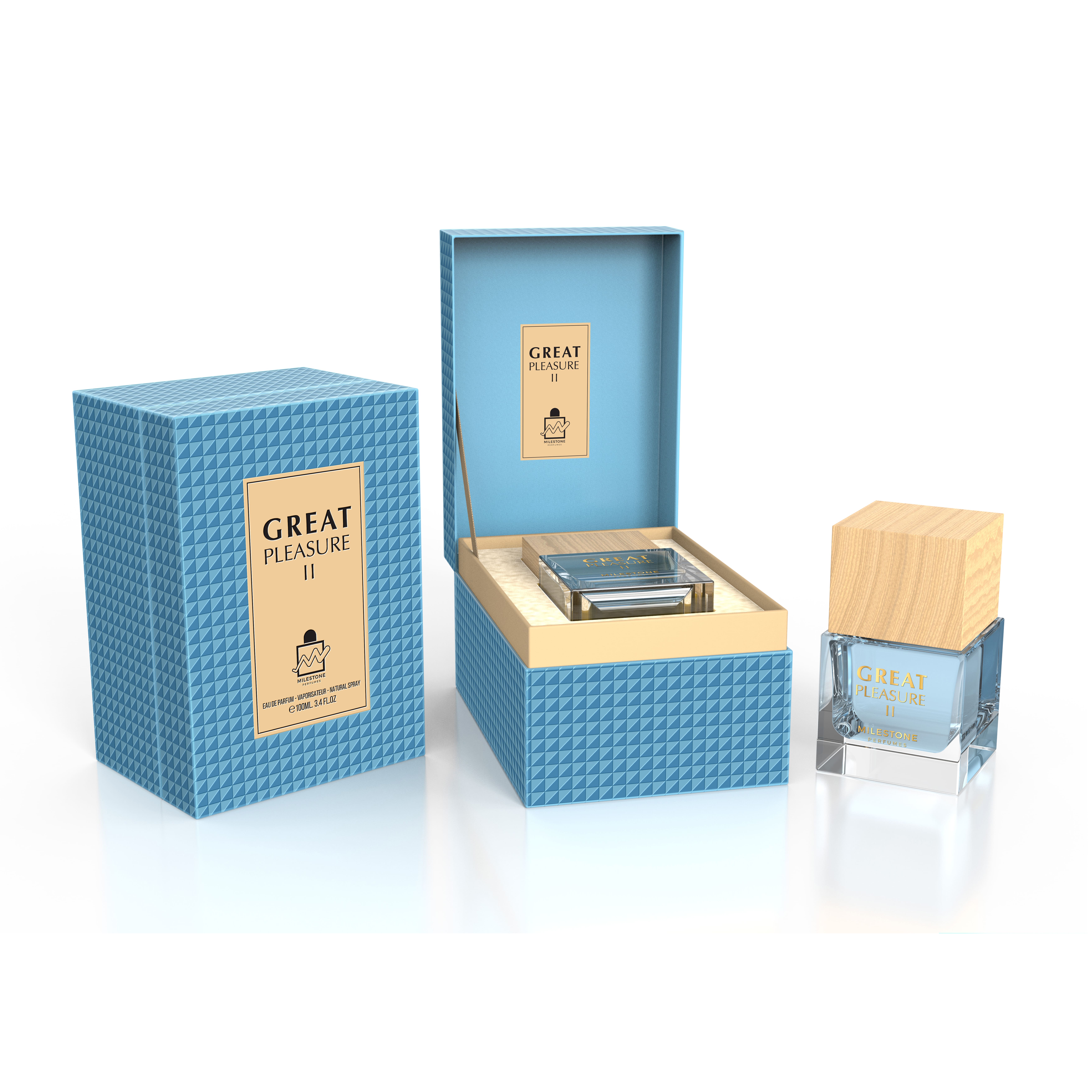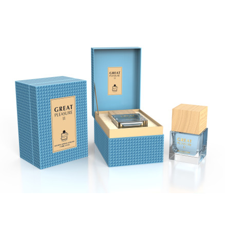 Флакон Great Pleasure II Milestone вражає своєю елегантною простотою. Строгі лінії, прозоре скло і ніжно-блакитний відтінок парфуму чітко сигналізують про характер парфуму. Коробка виглядає сучасно й витончено.