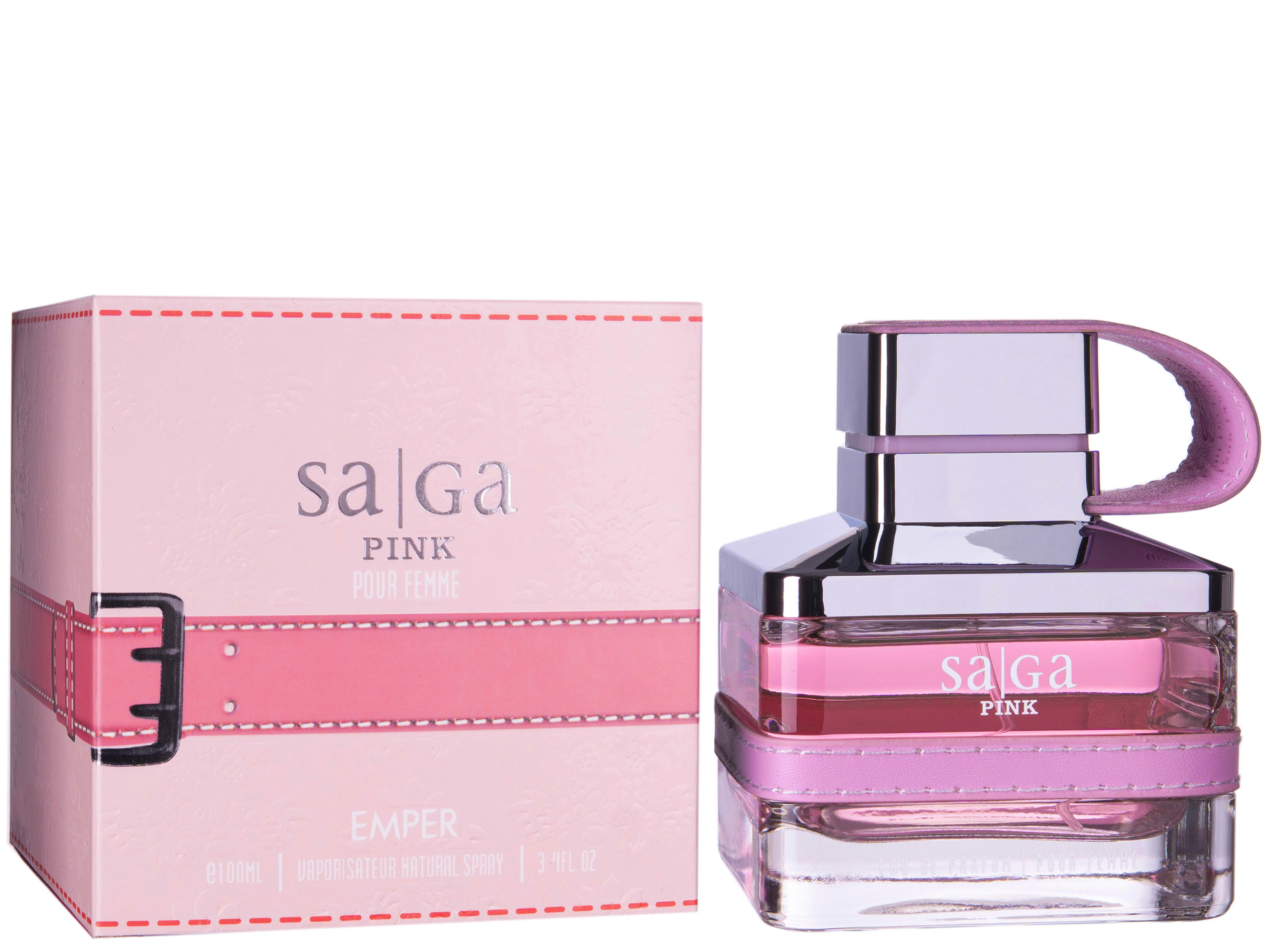 В першу чергу в парфумі Saga Pink Emper в очі кидається стильний флакон. Такийже, як у всій серії ароматів Saga, він кубічної форми, прикрашений шкірянимивставками і має кришку-магніт, яка дозволяє автоматично закривати парфум. Шкірянівставки, під стать жіночному аромату, ніжно-рожевого кольору. Парфум подаруєквіткове задоволення на весь день. Початкова нота звучить ніжною фіалкою іфруктовим міксом стиглого мандарина і солодкої сливи. Серце розкриваєтьсячарівною фрезією, димним ветивером і пряним кардамоном. Шлейф додаєземлистий запах моху і солодкість ванілі. Подарує романтичний настрій і віднесе взелену юність.